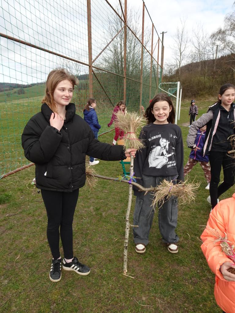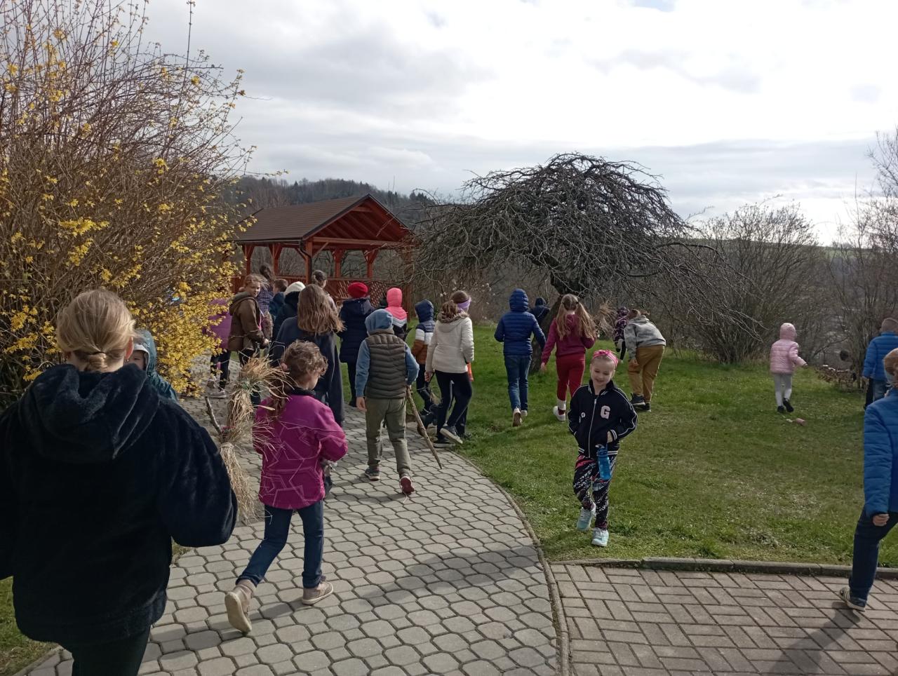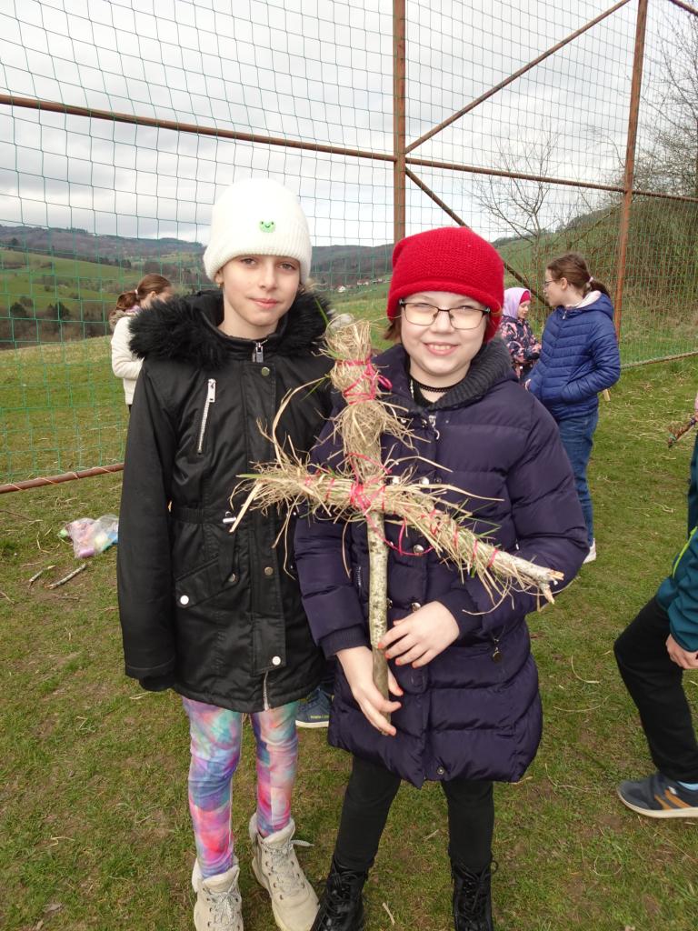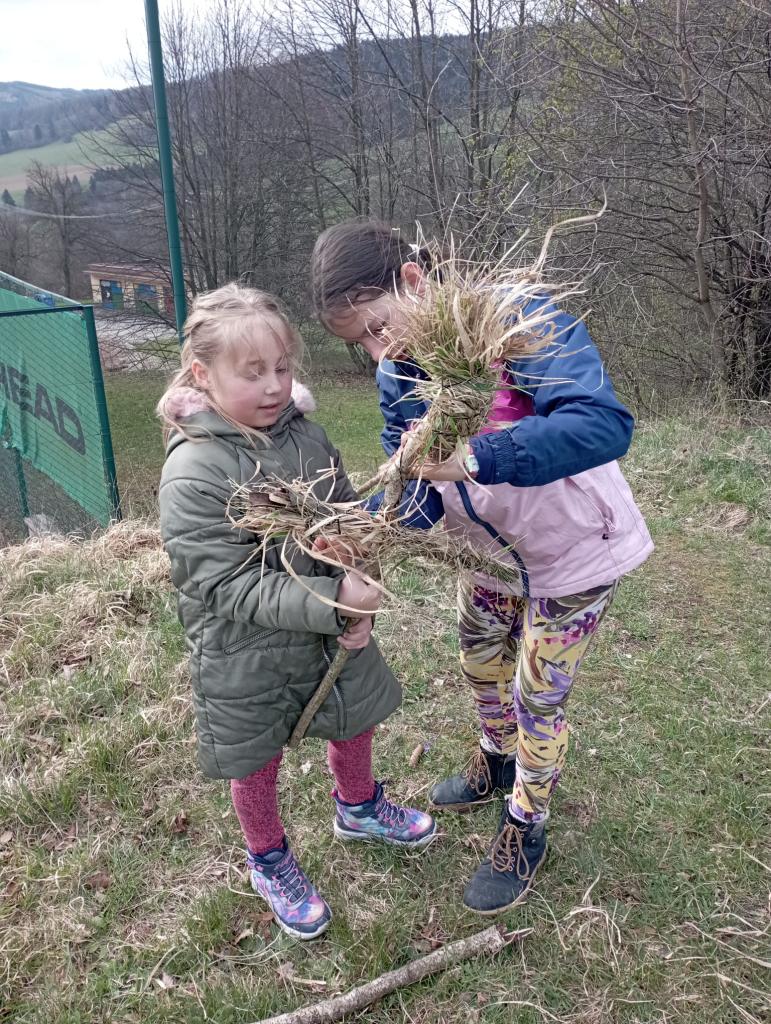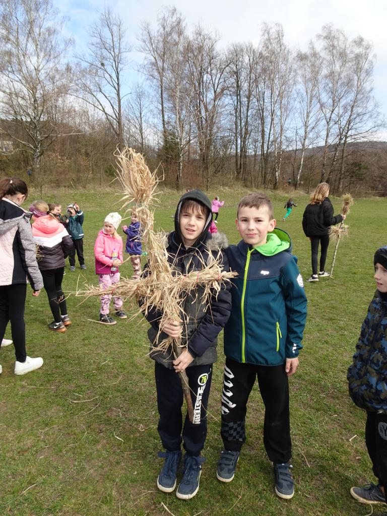 Chtěli bychom už zimu poslat pryč, a proto jsme si dnes vyrobili morany, jednu z nich jsme uložili k zimnímu spánku na hřišti, zbytek máme zatím ještě kolem školy. Hledali jsme poschovávaná čokoládová vajíčka. Druhá a třetí třída upekla sušenky a buchtu. Dívky pak zdobily vajíčka voskem a cibulovými slupkami a chlapci si pletli pomlázku.