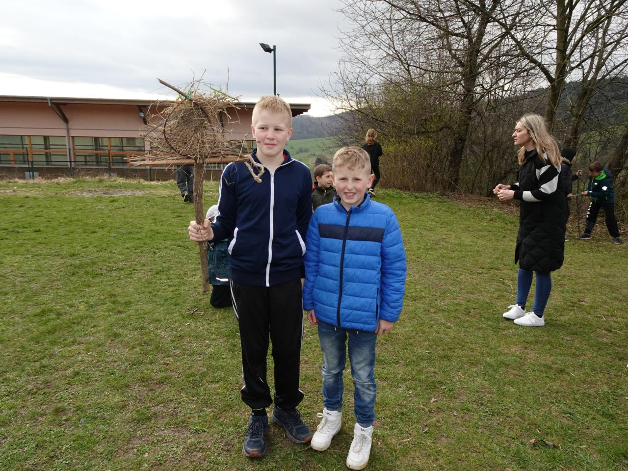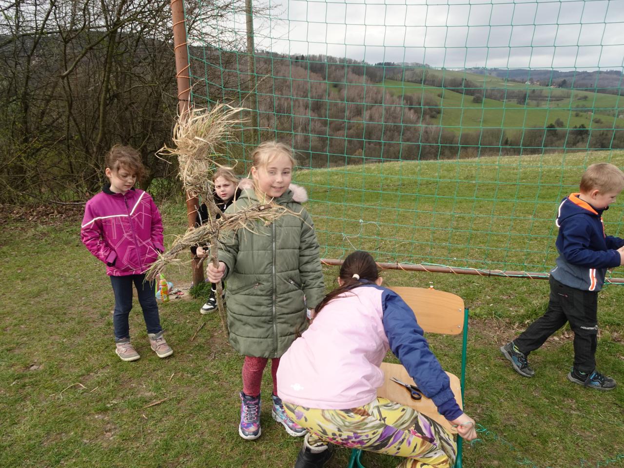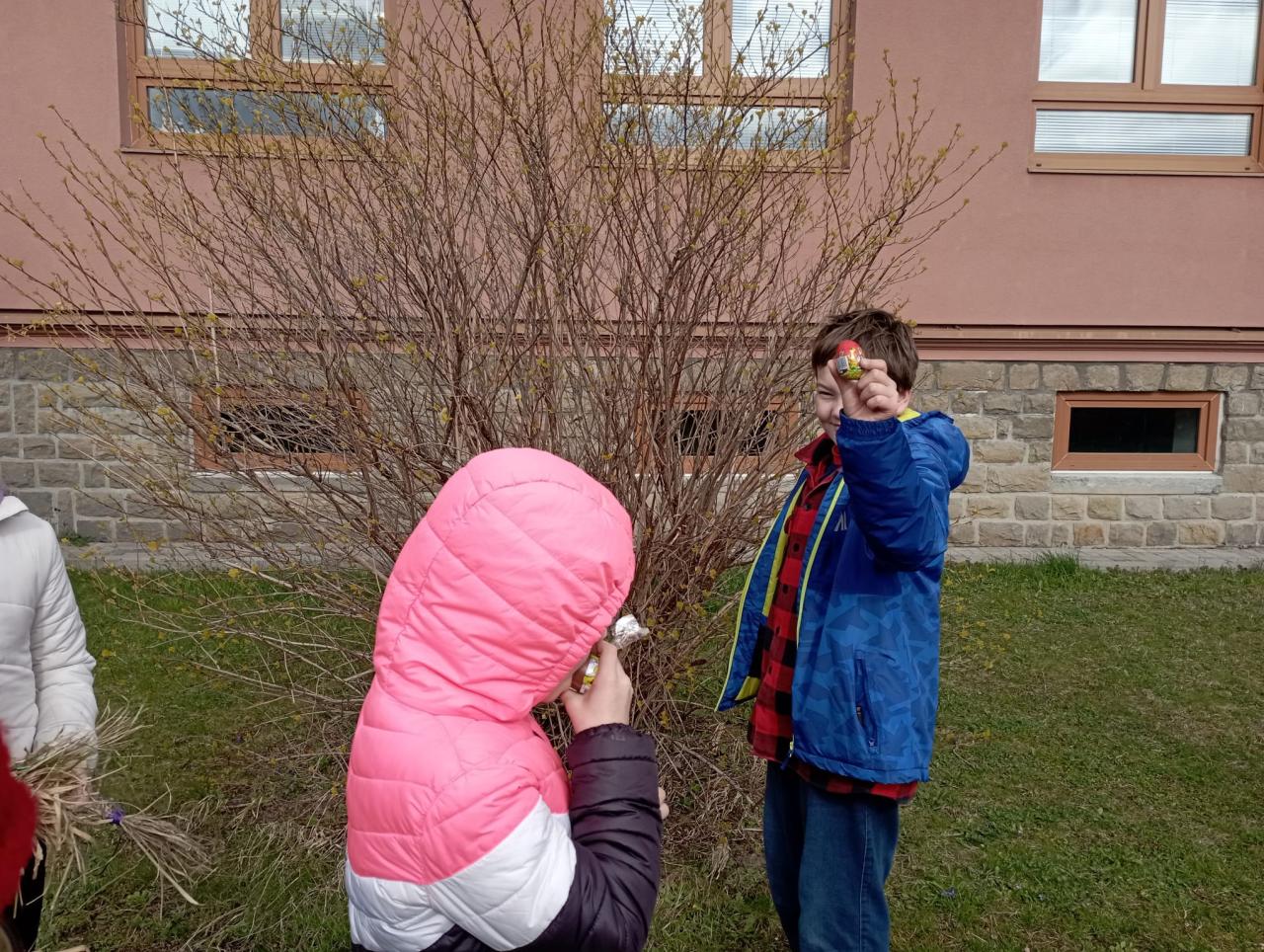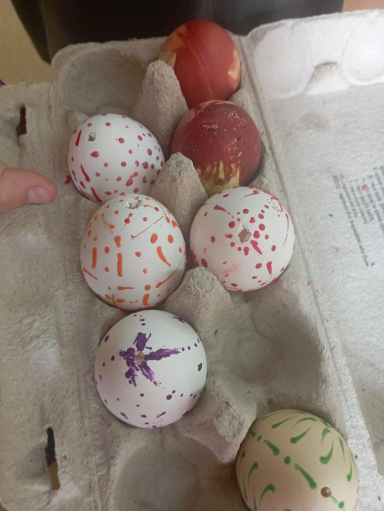 Chtěli bychom už zimu poslat pryč, a proto jsme si dnes vyrobili morany, jednu z nich jsme uložili k zimnímu spánku na hřišti, zbytek máme zatím ještě kolem školy. Hledali jsme poschovávaná čokoládová vajíčka. Druhá a třetí třída upekla sušenky a buchtu. Dívky pak zdobily vajíčka voskem a cibulovými slupkami a chlapci si pletli pomlázku.