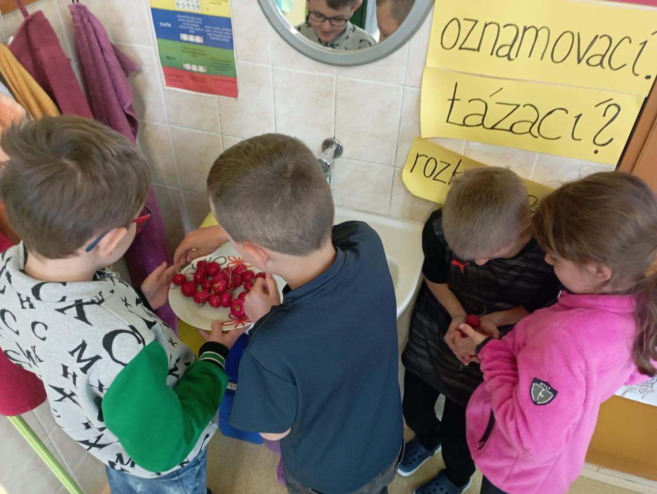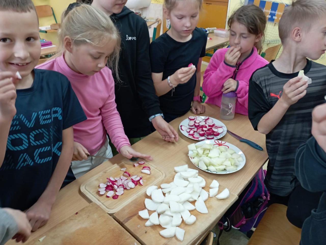Ve středu 24.4. bylo pro nás ve znamení ředkviček a kedluben. Povídali jsme si o nich, ochutnávali je a pak je malovali. Chuťově vyhrála bílá ředkvička a na paty jí šlapala kedlubna.